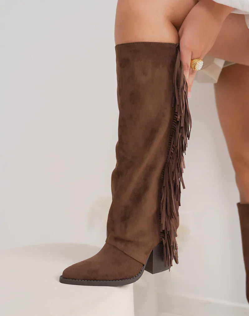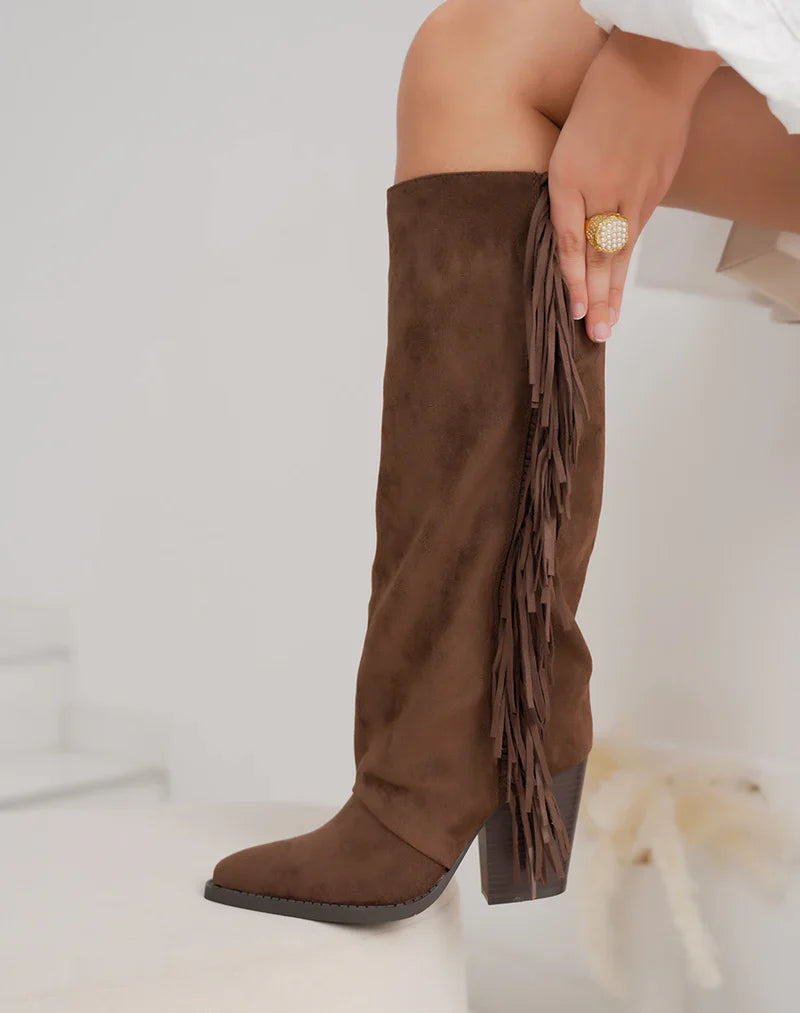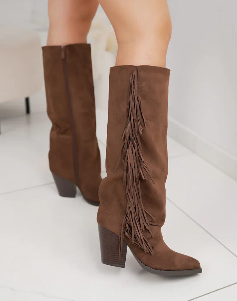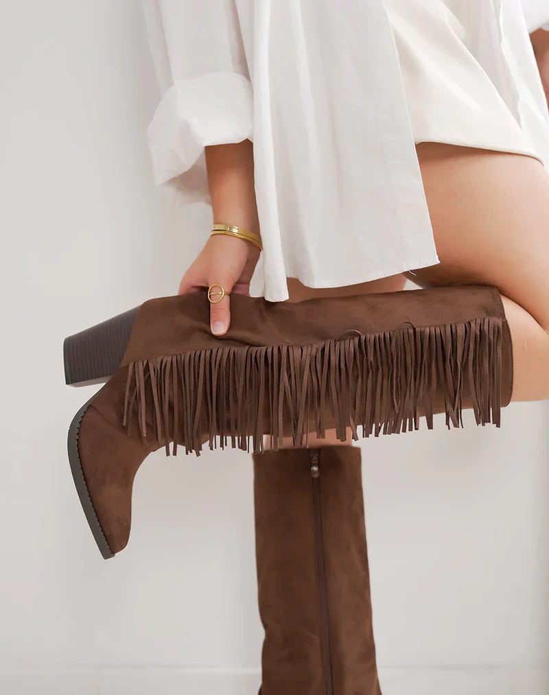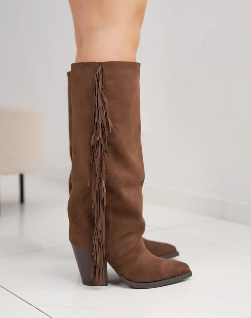 For en stilig western-touch velger du Fringle Suedine Støvler. Disse iøynefallende støvlene er laget av myk suedine og er dekorert med lekne fransker langs skaftet. Den solide blokkhælen gir ekstra lengde og komfort.