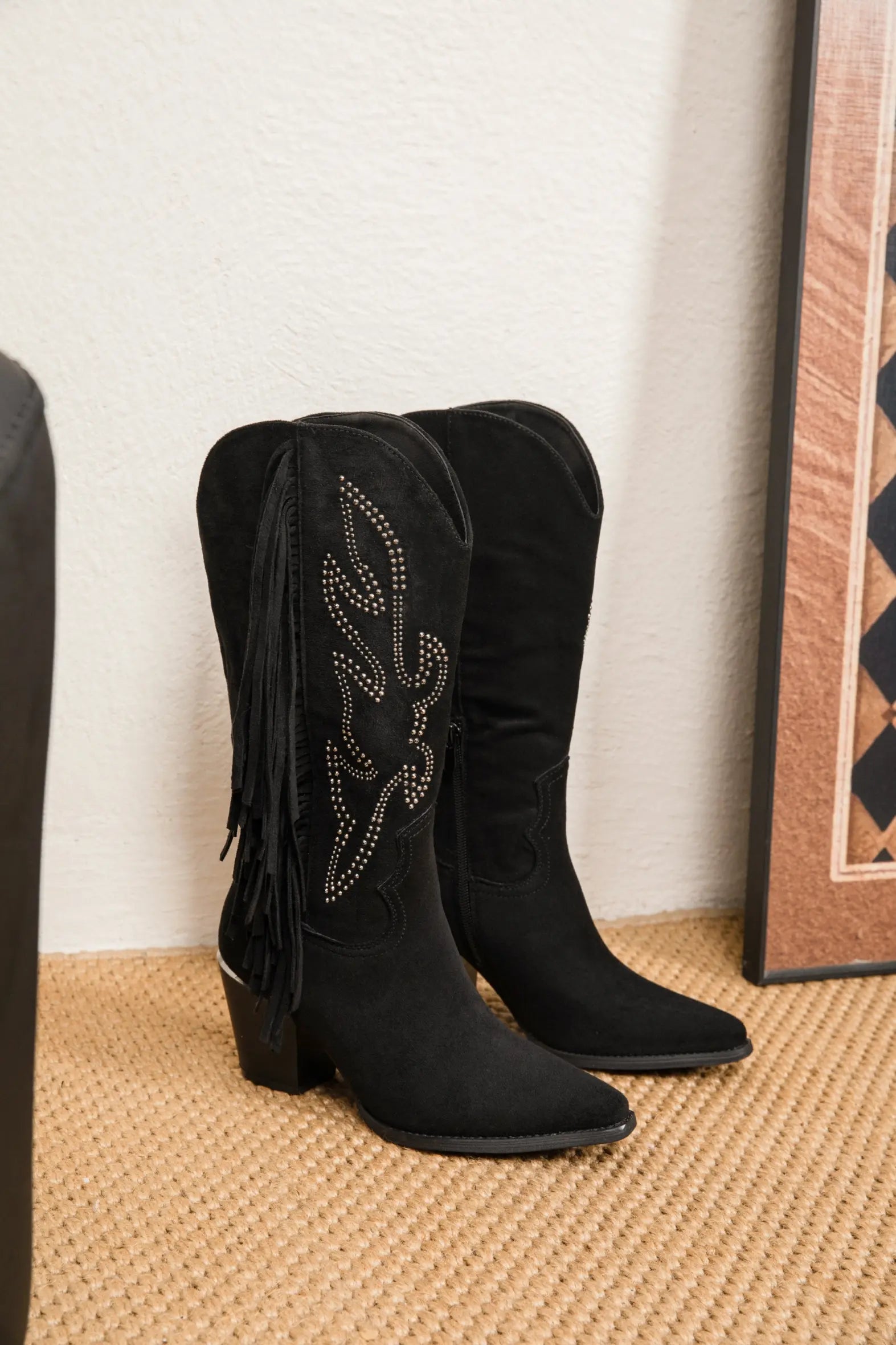 Lag et statement med våre Carla Fringe Boots – den perfekte kombinasjonen av western-vibber og moderne stil. Disse støvlene har elegante frynser og glitrende nagler på siden for en ekstra stilfull touch. Komfortable og trendy: kan brukes fra casual til festivallook!