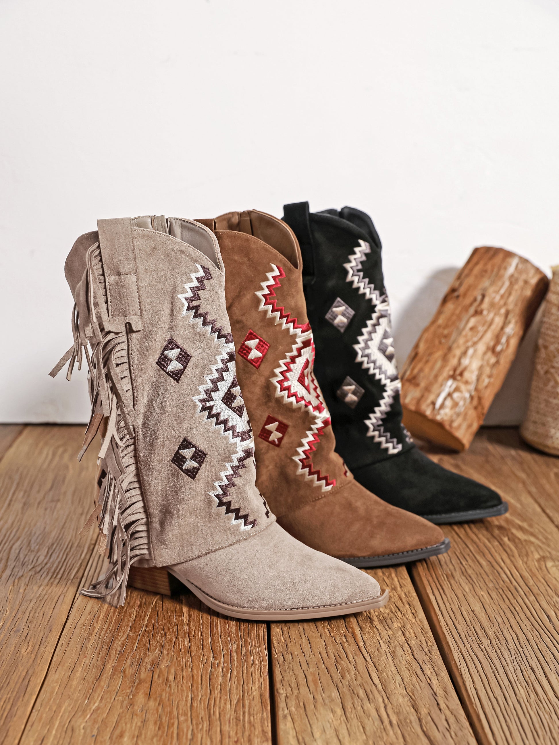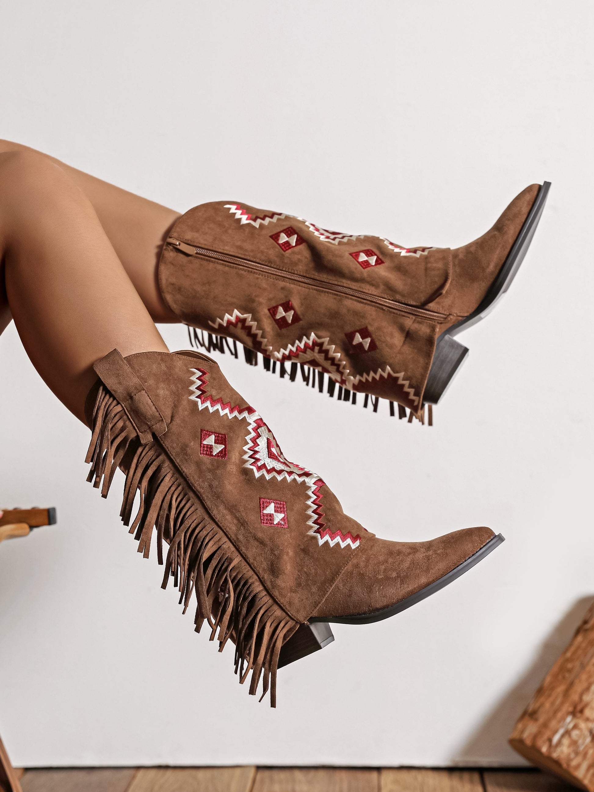 La stilen din tale med Cover Fringe Støvler – en perfekt blanding av boho og western vibes. De iøynefallende frynser og etniske broderier gir disse støvlene et unikt utseende som alltid får deg til å skille deg ut.