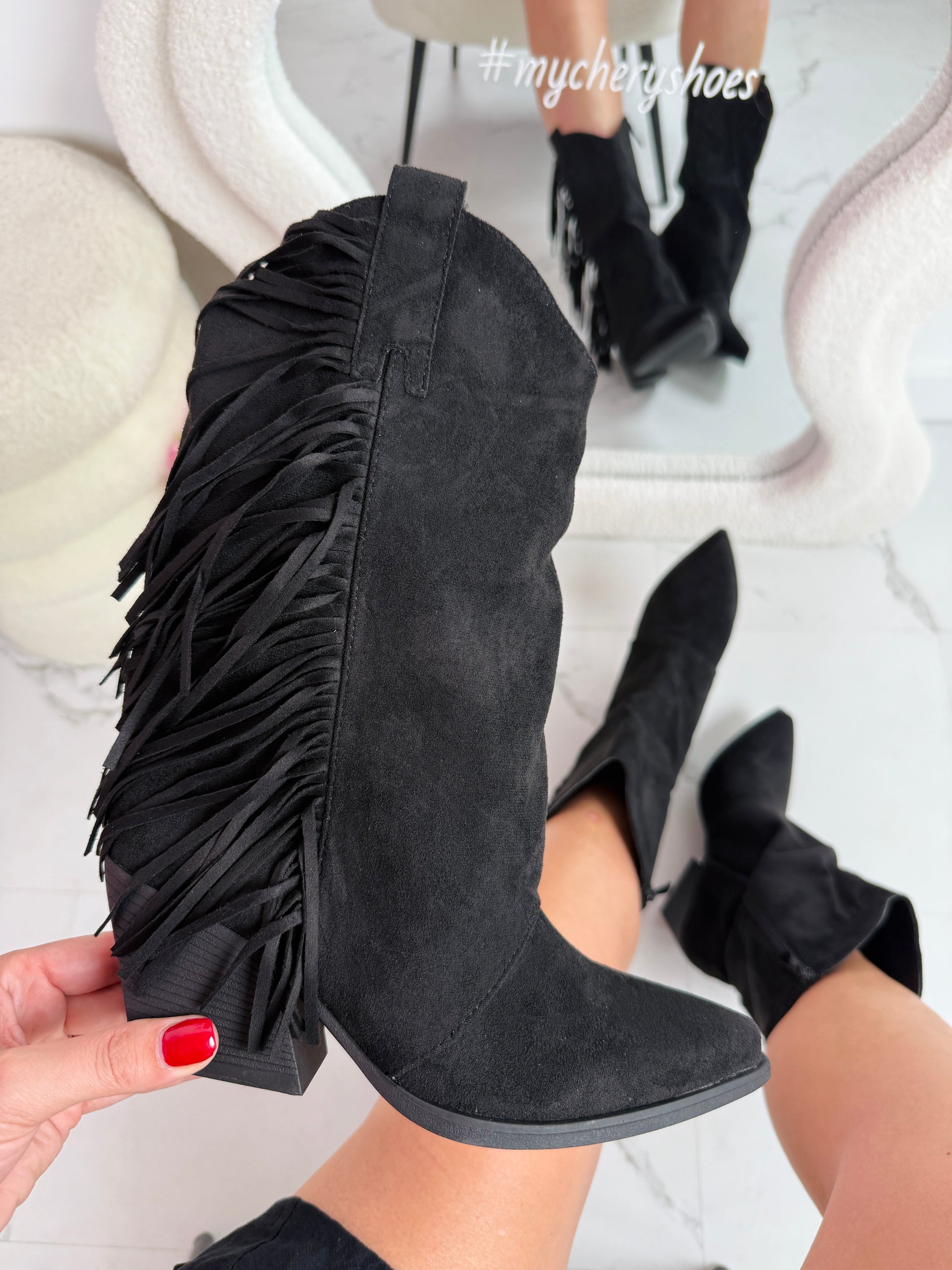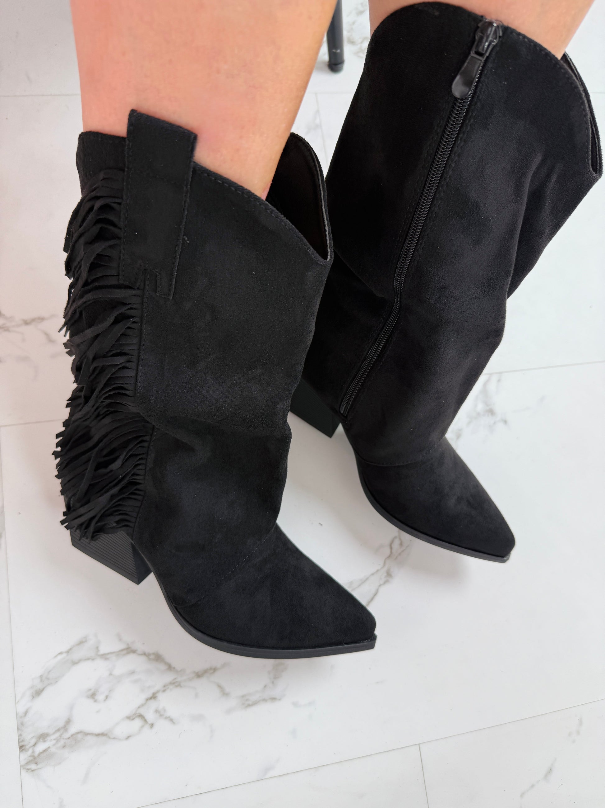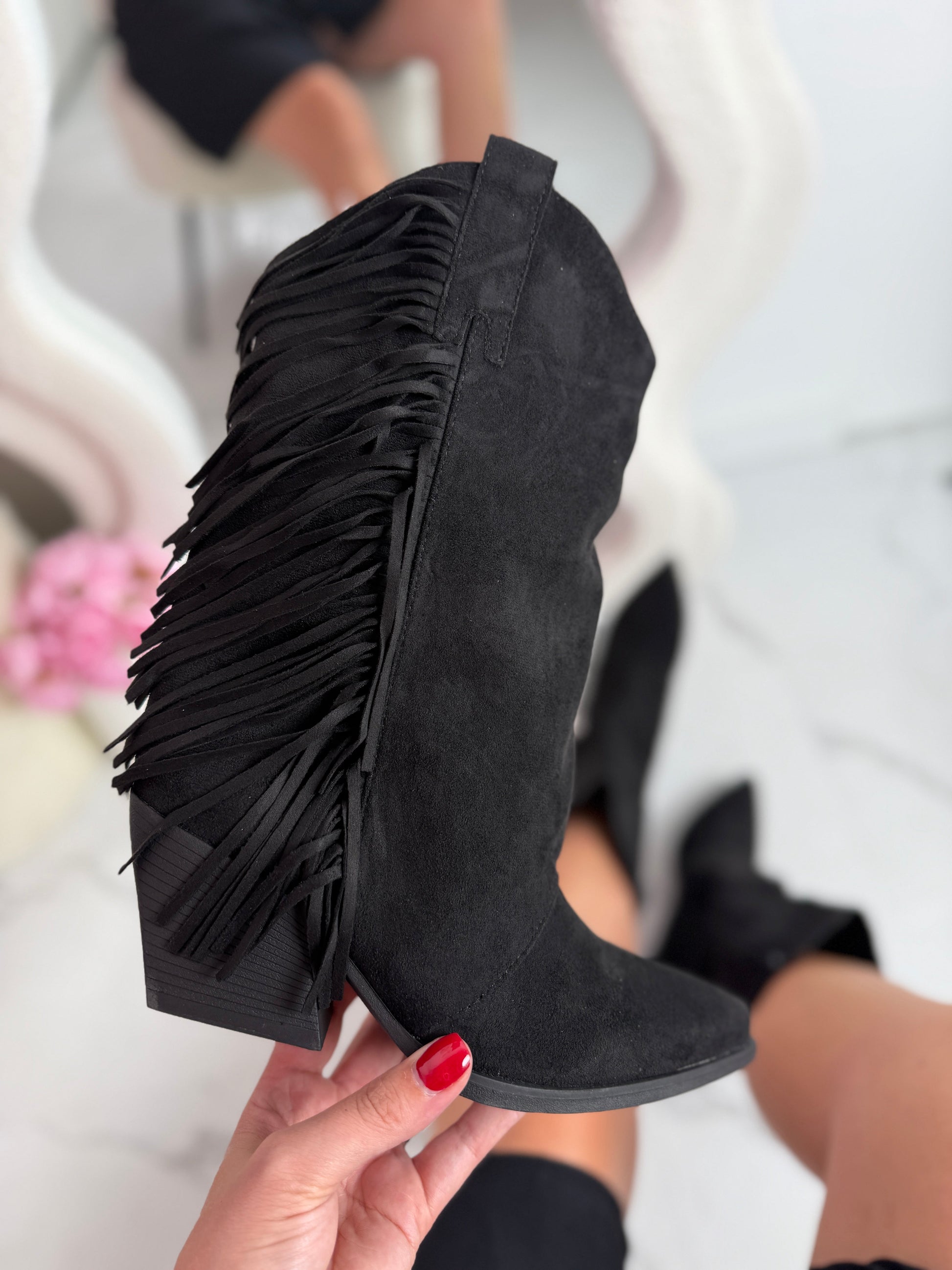 De Fringle Western Støvler er den perfekte blandingen av western-vibber og feminin sjarm. Suede-looket med lekne frynser og delikate nagler gir hvert antrekk et bohemsk løft. Takket være den komfortable blokkhælen på 5 cm kan du gå stilfullt og uanstrengt – fra lunsjdate til festival.