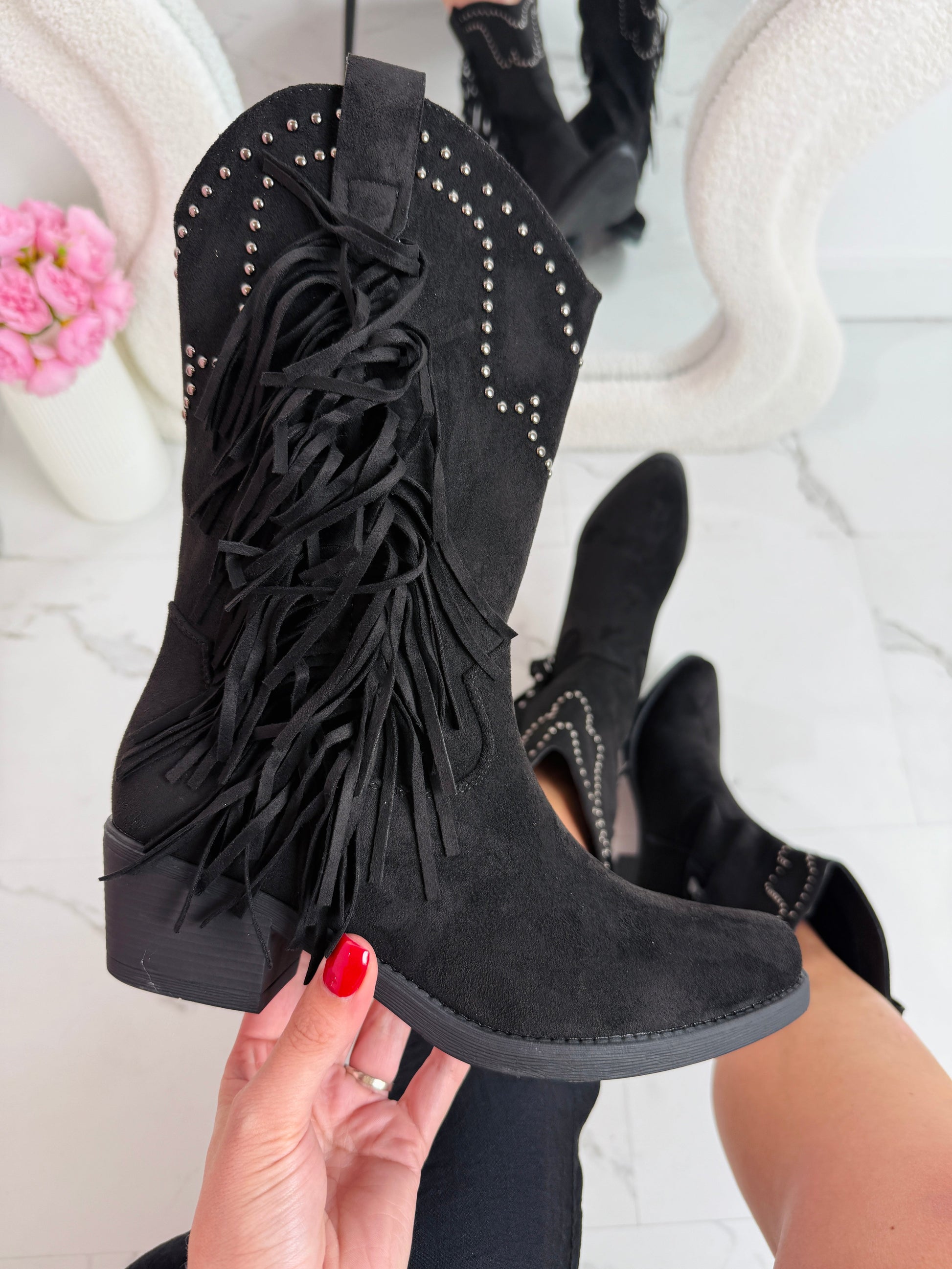 De Fringle Western Støvlene er den perfekte blandingen av western-vibber og feminin flair. Suedeserien med lekne frynser og delikate nagler gir hvert antrekk et bohemsk løft. Takket være den komfortable blokkhælen på 5 cm, kan du gå stilfullt fra lunsjdato til festival uten problemer.