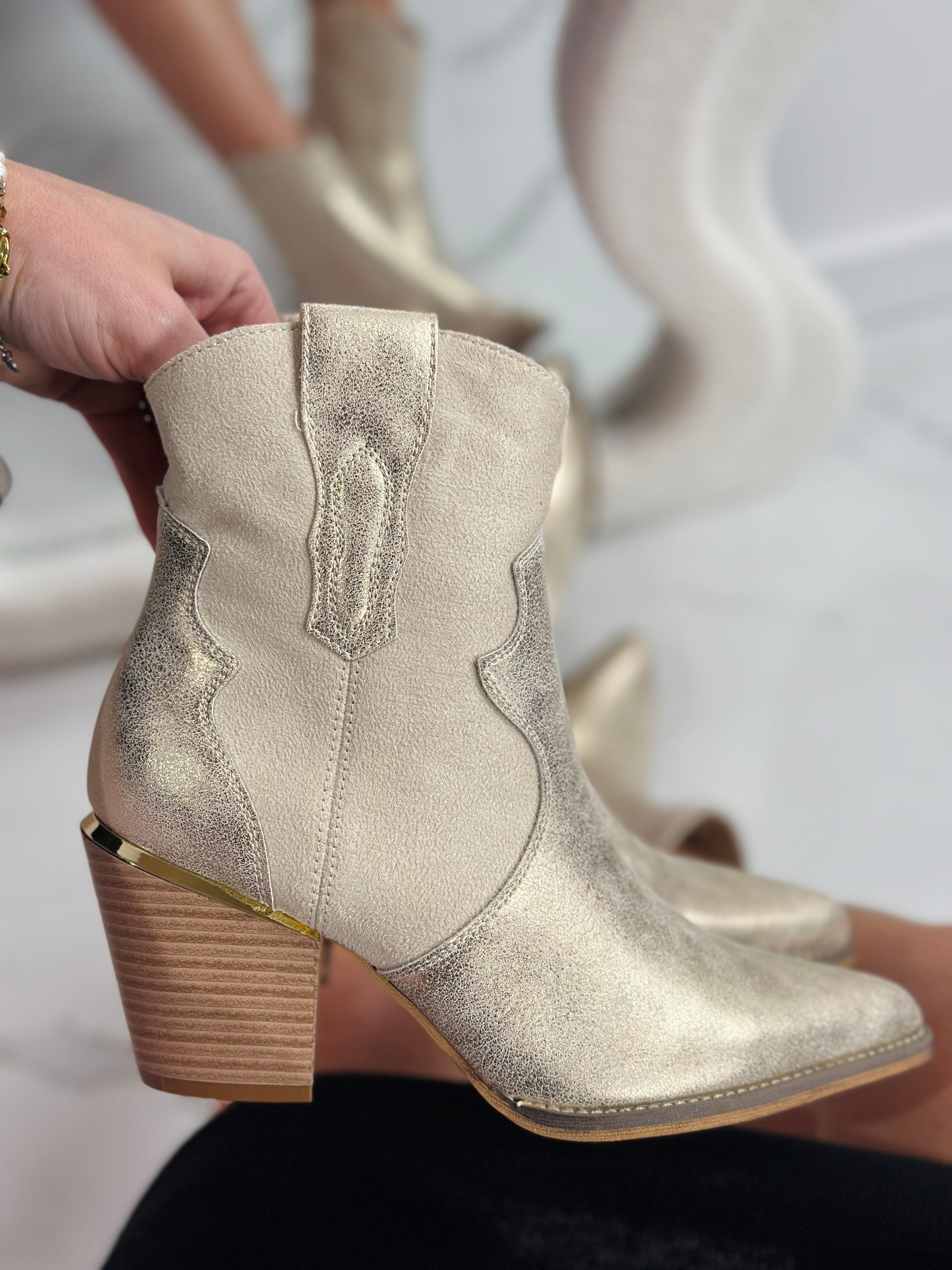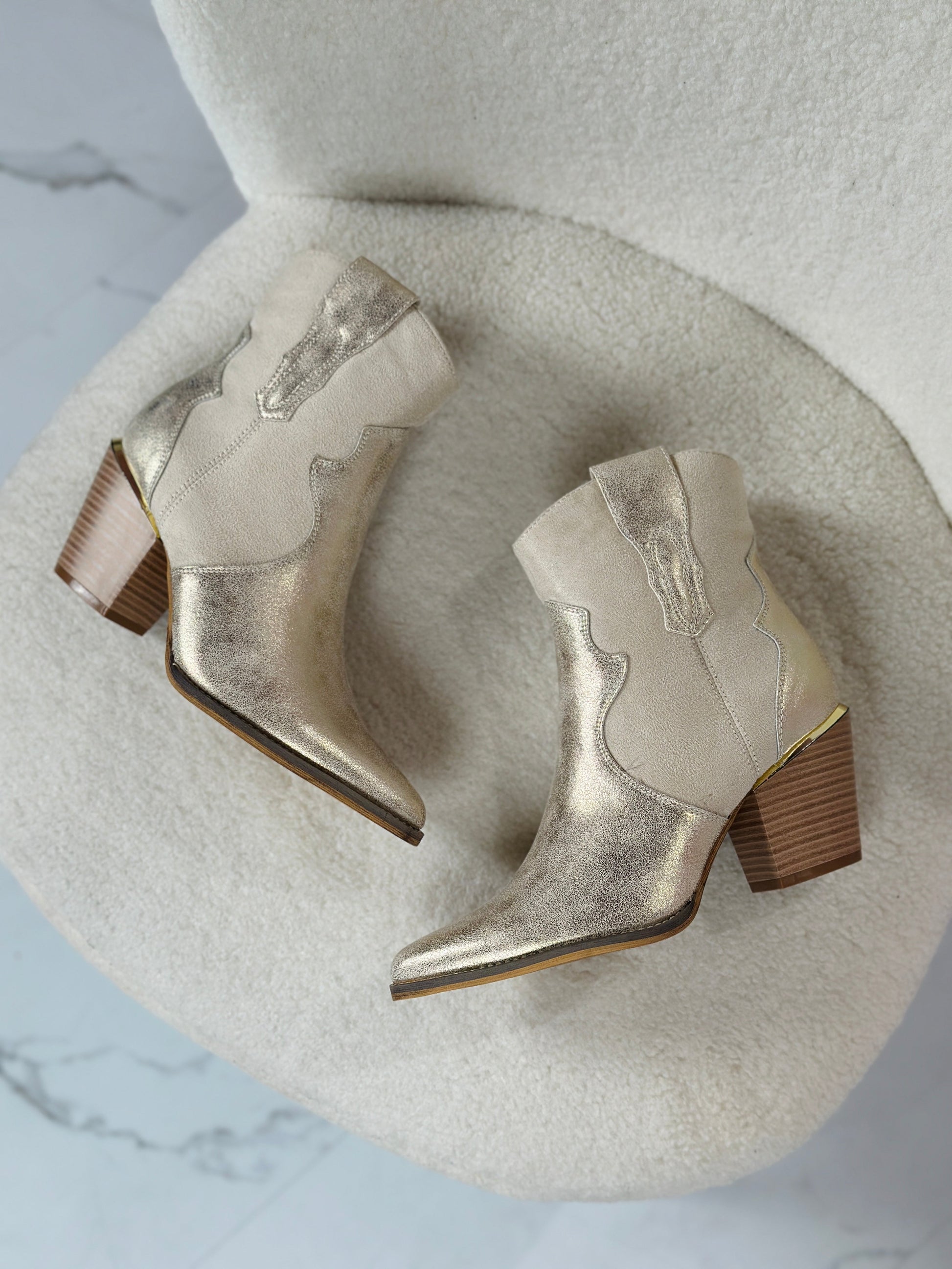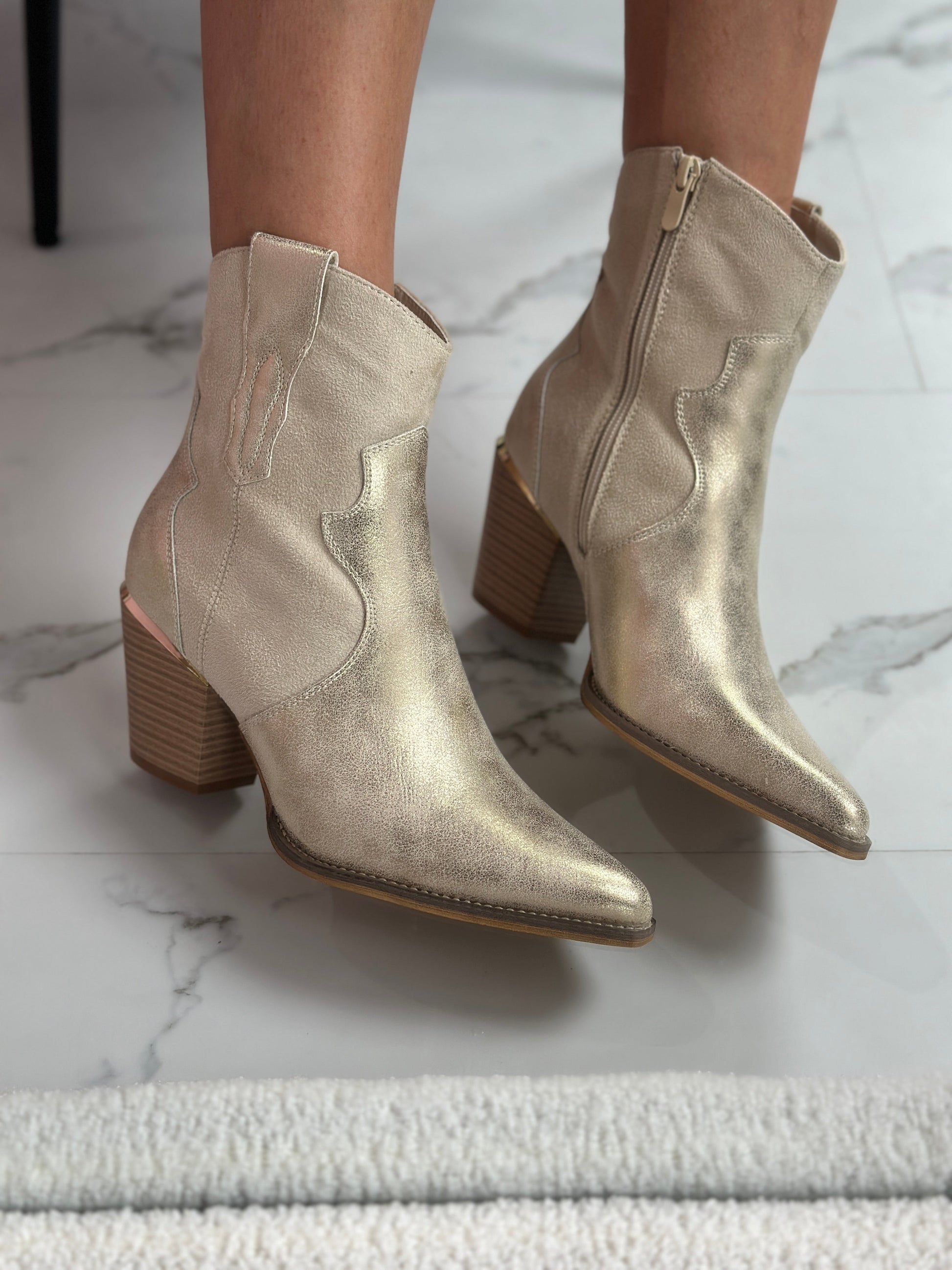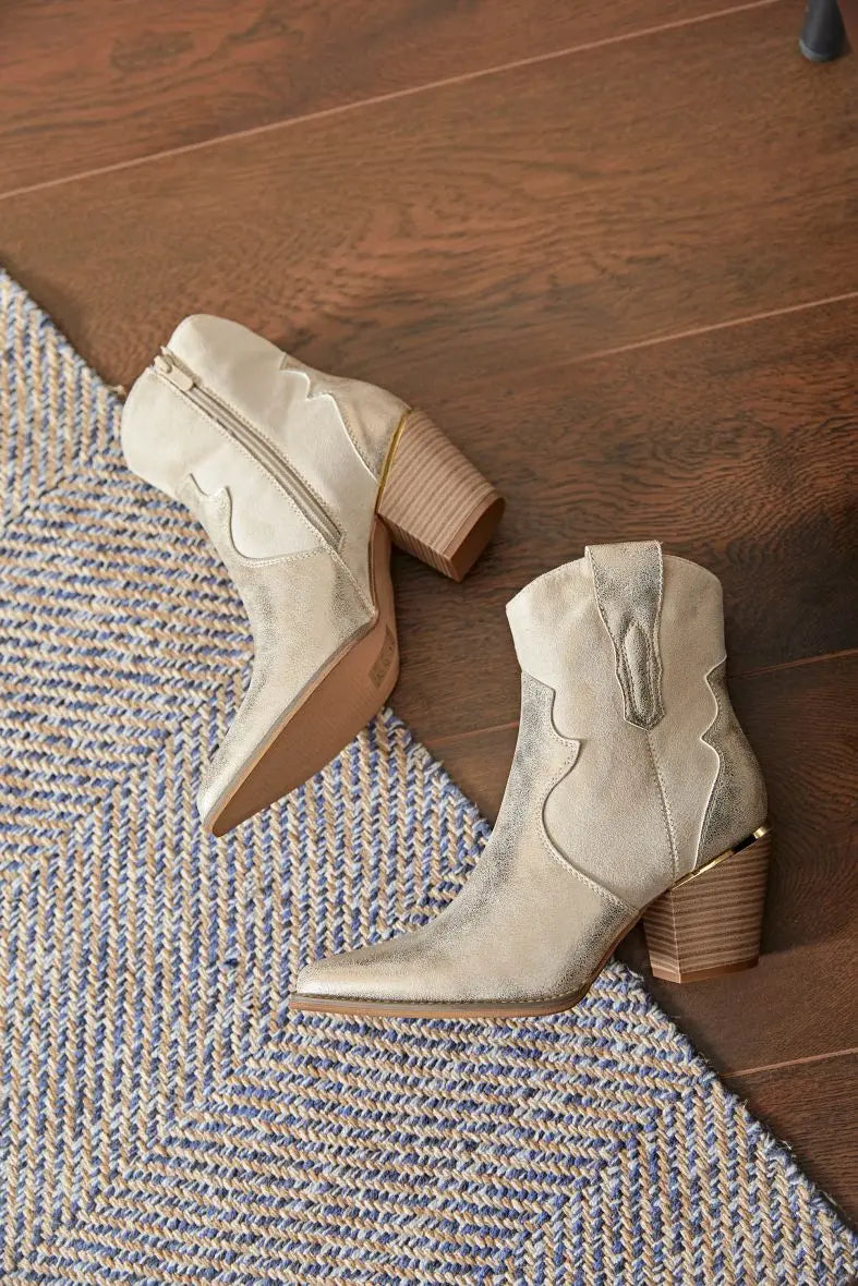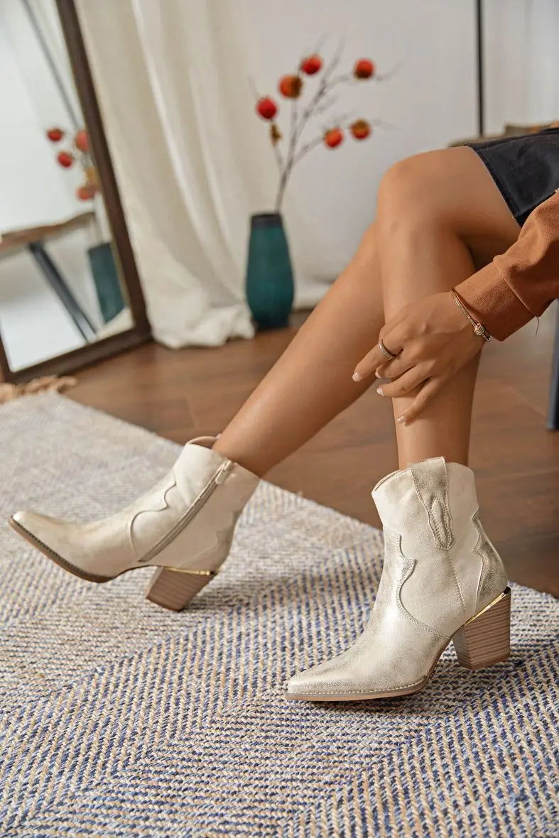 De Giavanna Gullstøvler er en sann øyefanger med sin subtile glans, stilige western-detaljer og gullfargede elementer. Laget av vegansk lær og med en solid hæl på 6,5 cm, tilbyr disse støvlene en perfekt balanse mellom komfort og eleganse.