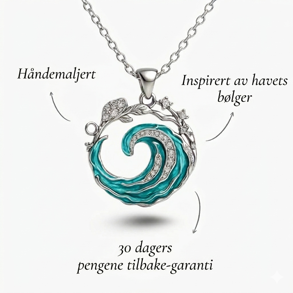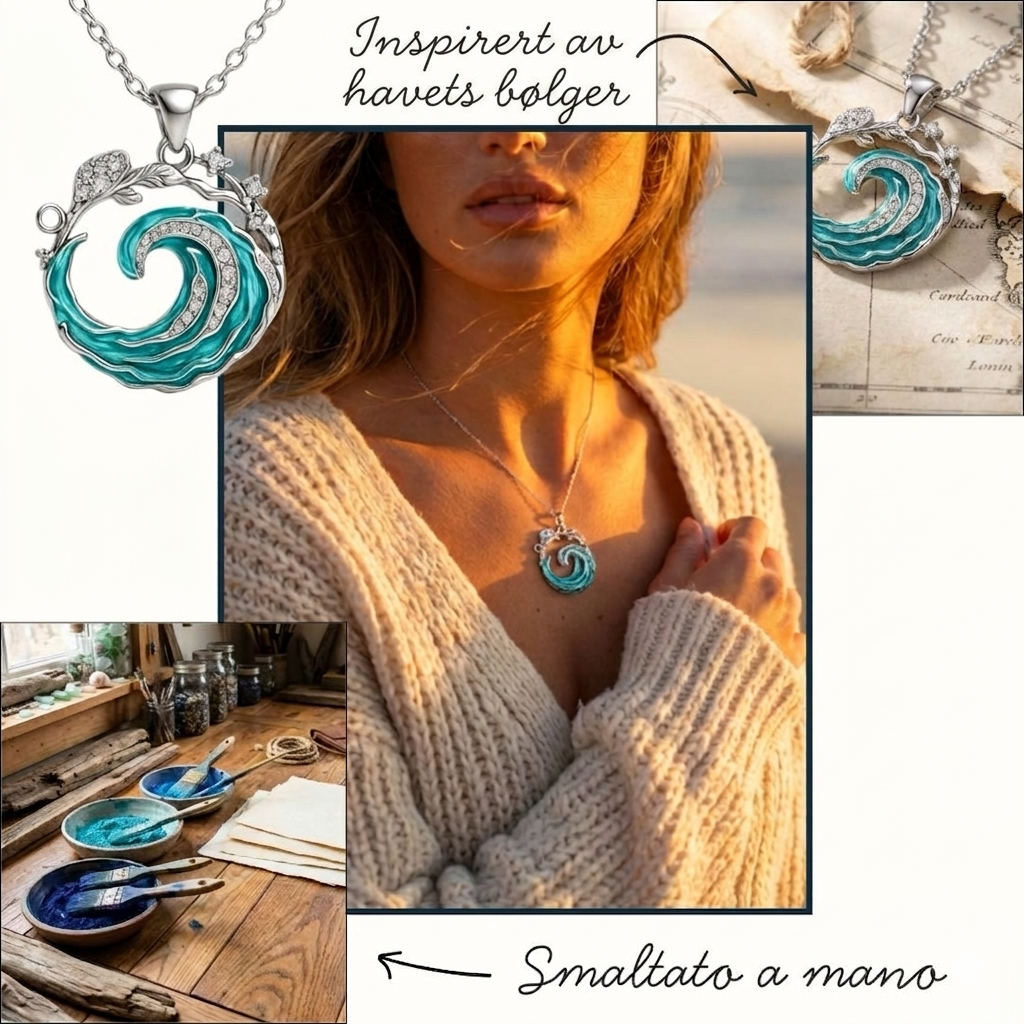 Dens pendant–bølge, blank og rik på detaljer, ser ut til å ha fanget et øyeblikk av havet for å forvandle det til et evig talisman: en lysende topp som snor seg rundt seg selv, beriket med små glitrende detaljer som gjenskaper magien av skummet som danser på stranden.
