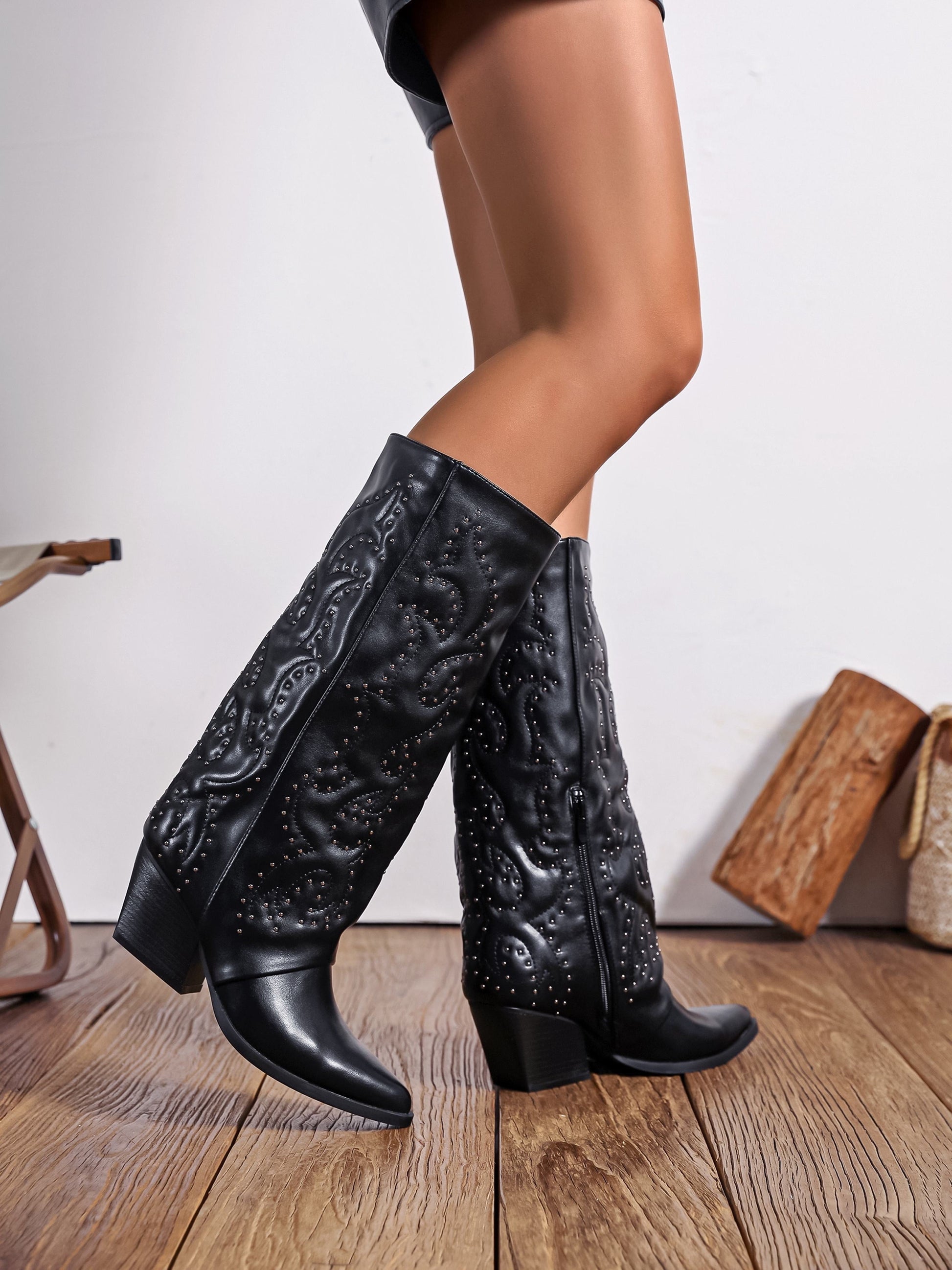 Trå stilfullt inn i den nye sesongen med Montana Cover Svarte Støvler – en ekte iøynefallende med western-vibber! Disse svarte støvlene er dekorert med et iøynefallende sømdesign og subtile nagler for et edgy, feminint preg. Den solide blokkhælen gir deg ekstra høyde og komfort, mens glidelåsen på siden gjør det enkelt å ta dem av og på. Perfekt å kombinere med en kjole eller denim-look!